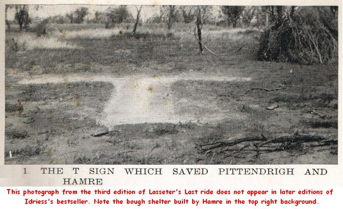 In late November 1930 the Central Australian Gold Exploration Company made arrangements to continue the search for Harold Lasseter and his reef. Phillip Taylor, accompanied by Paul Johns with eight camels carrying additional supplies and petrol, was instructed by the Company to proceed to Illbilla, refurbish the camp and airstrip and expect the Golden Quest II sometime between the 15th to 20th of December. The plane would be flown by Leslie Pittendrigh with S. J. Hamre, the Company's mining engineer, as his passenger. It was a difficult journey for the men with frequent lengthy delays caused by very wet weather and fractious camels. Taylor arrived on the 15th and found the camp fairly intact although Lasseter had removed a sizeable quantity of supplies. The following day Taylor had cause to reflect on the folly of the open ended arrangements regarding Pittendrigh's expected date of arrival, "not knowing where the plane is, or when it will arrive; most unsatisfactory and dangerous". Taylor spent the next six days tidying up the camp and airstrip, attending and photographing Aboriginal ceremonies and pottering about, wondering how he and Johns might enjoy Christmas with frequent thoughts on cool English winters as the Australian sun blazed directly overhead. On the 20th, Aboriginals camped in the vicinity of Mount Russell, reported to Taylor that they had seen a plane to the north and flying east earlier in the day, that afternoon Rolfe Entata arrived in camp and told Taylor that he had seen a plane to the south of Illbilla flying in the direction of Alice Springs. Taylor concluded this was Pittendrigh and Hamre and having failed to locate Illbilla had returned to Alice Springs for the night, all things being well he could expect them to return to Illbilla the following day. The Golden Quest II did not arrive the next day and on the 22nd, "Still no sign of the plane, am afraid he ran out of petrol when looking for this 'drome, & had a forced landing between here and A. S.". Phillip Taylor was only too right, but, not knowing what arrangements Pittendrigh had made, there was very little he could do from Illbilla for the time being. Pittendrigh and Hamre had left Alice Springs at 8.45 a.m. on the 20th and after three and a half hours flying, arrived in the vicinity of Illbilla but apparently had mistaken Mount Russell, located about seven miles to the north of Illbilla, for the Ehrenbergs, and failing to locate the airstrip or sight any smoke signals after a wide circuit of the ranges, decided to return to Alice Springs. The plane ran out of fuel about ten miles north west of Haast Bluff and Pittendrigh made a safe landing in a small clearing surrounded by mulga, "Pittendrigh climbed from the cockpit, remarking, 'that's that' as he scratched his ear". And much of what happens to these misguided adventurers over the following three weeks is from the pen of Idriess in Lasseter's Last Ride. No doubt Idriess interviewed Pittendrigh and Hamre on their return to Sydney and devotes over forty pages of his bestseller to their misfortunes. After tying the plane down in a narrow laneway between the mulga the grounded travellers boiled the billy and had a meal while planning their next move, "they decided to attempt the walk back to Alice Springs" with five tins of meat, a bottle of malted milk tablets, eight biscuits and four gallons of water and carrying the planes compass in the billy can. The revolver was left in the plane, they had not been able to find any ammunition to fit it in Alice Springs. The following day the tinned meats were discarded thinking their saltiness would increase thirst. Two days after the forced landing the water bags were empty and Hamre prepared for the inevitable when a local thunderstorm arrived, wringing water from their clothes and and refilling the bags with muddy liquid Hamre and Pittendrigh marched on east. That evening the men arrived at the Dashwood Creek, "and walked right on to a decent pool" apparently several hundred metres downstream from Houston's Soak. The trek continued next morning, the 24th, but by Christmas day and within sight of Mount Hay the exhausted men realised that they had no hope of reaching their goal and returned to the Dashwood. On Boxing day, feeling 'decidedly hungry' they retraced their steps west in search of the tinned meats discarded on the 21st and after many hours located the supplies, one tin was scoffed immediately leaving three tins and sixteen milk tablets. They returned to the Dashwood, the water bag was empty when they arrived. Back at Illbilla Taylor had decided that if he had not heard anything by the 26th then Johns must travel to Hermannsburg and raise the alarm, the day arrived with no word from Pittendrigh or Colson and Johns was on his way at first light, arriving at the Mission on the evening of the 29th. Messages to Carrington, the Government Resident, and the Company were sent next morning. Carrington, now very alert to the possibility of another publicity stunt by the Company thoroughly checked Johns story via Hermannsburg and satisfied that the Golden Quest II was missing contacted Arthur Blakeley, the Minister for Home Affairs, late that day. Blakeley received the telegram that evening and immediately contacted the Royal Australian Air Force, Flight Lieutenant Charles Eaton had his orders by noon the following day, in company with Flying Officer Gerrand he was "to proceed in 'Moth' aircraft A-34 and A-37 to Alice Springs at dawn on 1/1/31". There is no record of Eaton's or Gerrand's thoughts on missing New Years celebrations, but the pilots left on schedule and arrived in Marree shortly after 6.00 p.m. that day, and landed in Alice Springs at noon the following day, a little under 17 hours flying time. The search for Pittendrigh and Hamre was now in the hands of the most competent inland pilot of the era, and Eaton wasted no time in making thorough preparations. After interviewing Carrington, Littlejohn and Colson a